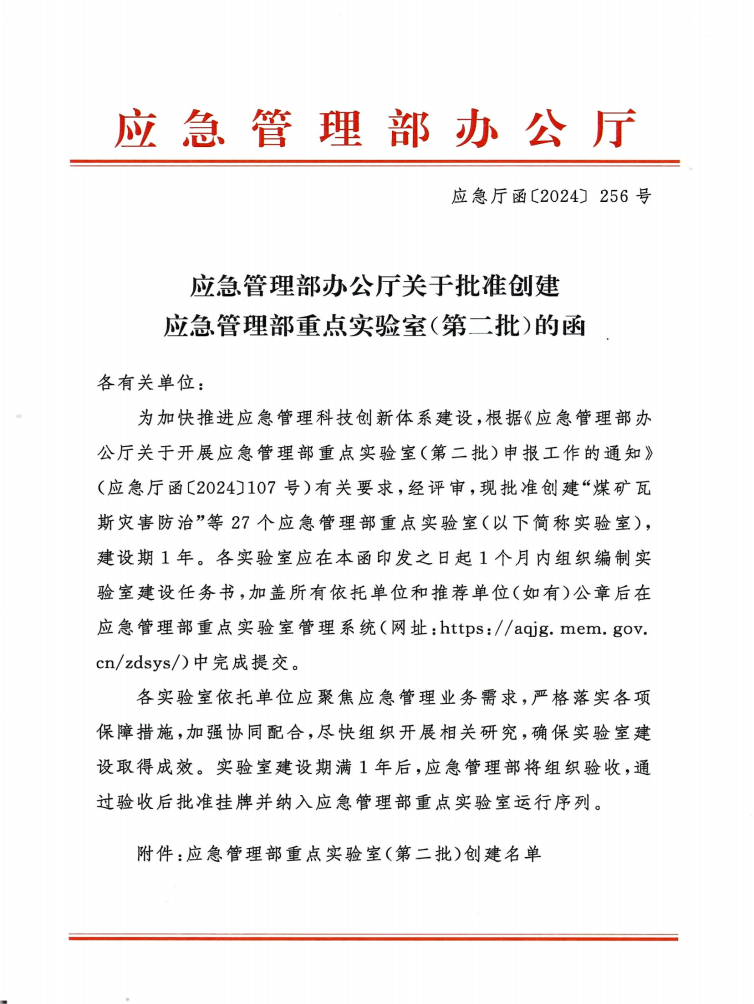近日,应急管理部发文(应急函〔2024〕256号),批准创建27个应急管理部重点实验室。beat365唯一官方网站作为依托参与单位获批“工贸行业安全风险防控联合创新应急管理部重点实验室”。我校将在本重点实验室建设中发挥工贸行业安全风险防控领域科研、学科、人才优势,推动安全应急领域产学研合作与产业链紧密结合的创新发展,为自治区安全与应急产业的可持续发展提供强有力的支撑。