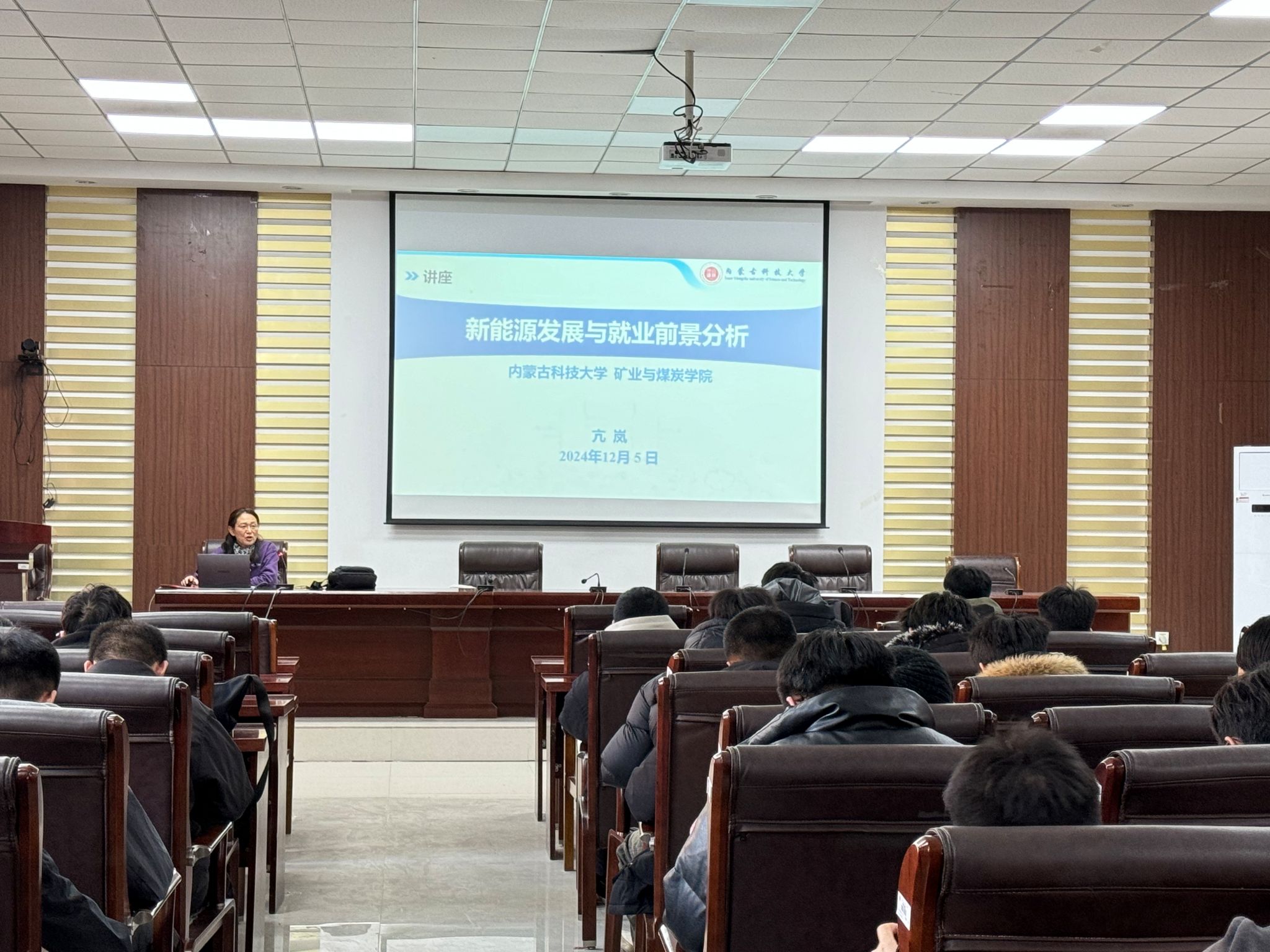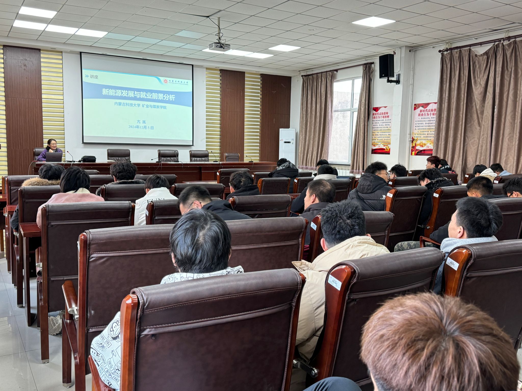 2024 年 12 月 5 日下午 16:00,beat365唯一官方网站在实验室训楼二楼会议室举行讲座,机电工程系教授亢岚主讲,矿山机电专业三个年级及电气自动化、机电一体化专业毕业班学生踊跃参与,主题为“新能源发展与就业前景分析”。