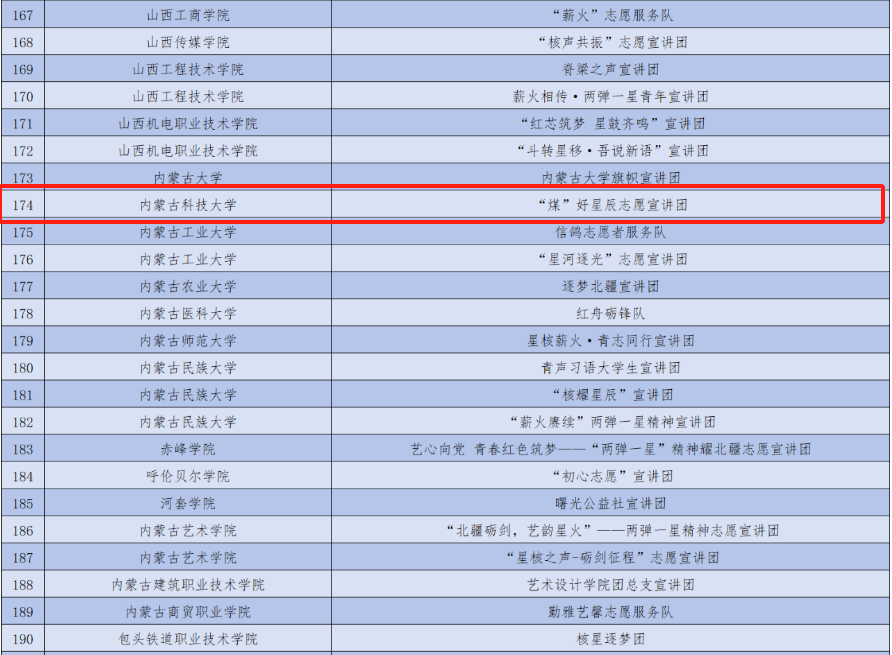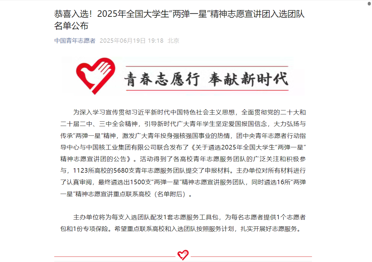 为深入学习宣传贯彻习近平新时代中国特色社会主义思想,全面贯彻党的二十大和二十届二中、三中全会精神,引导新时代广大青年学生坚定爱国报国信念,大力弘扬与传承“两弹一星”精神,激发广大青年投身强核强国事业的热情,团中央青年志愿者行动指导中心与中国核工业集团有限公司联合发布了《关于遴选2025年全国大学生“两弹一星”精神志愿宣讲团的公告》。活动得到了各高校青年志愿服务团队的广泛关注和积极参与,1123所高校的5680支青年志愿服务团队提交了申报材料。主办单位对所有材料进行了认真审阅,最终遴选出1500支“两弹一星”精神志愿宣讲服务团队,同时遴选16所“两弹一星”精神志愿宣讲重点联系高校。我校beat365唯一官方网站“煤”好星辰志愿宣讲团成功入选。