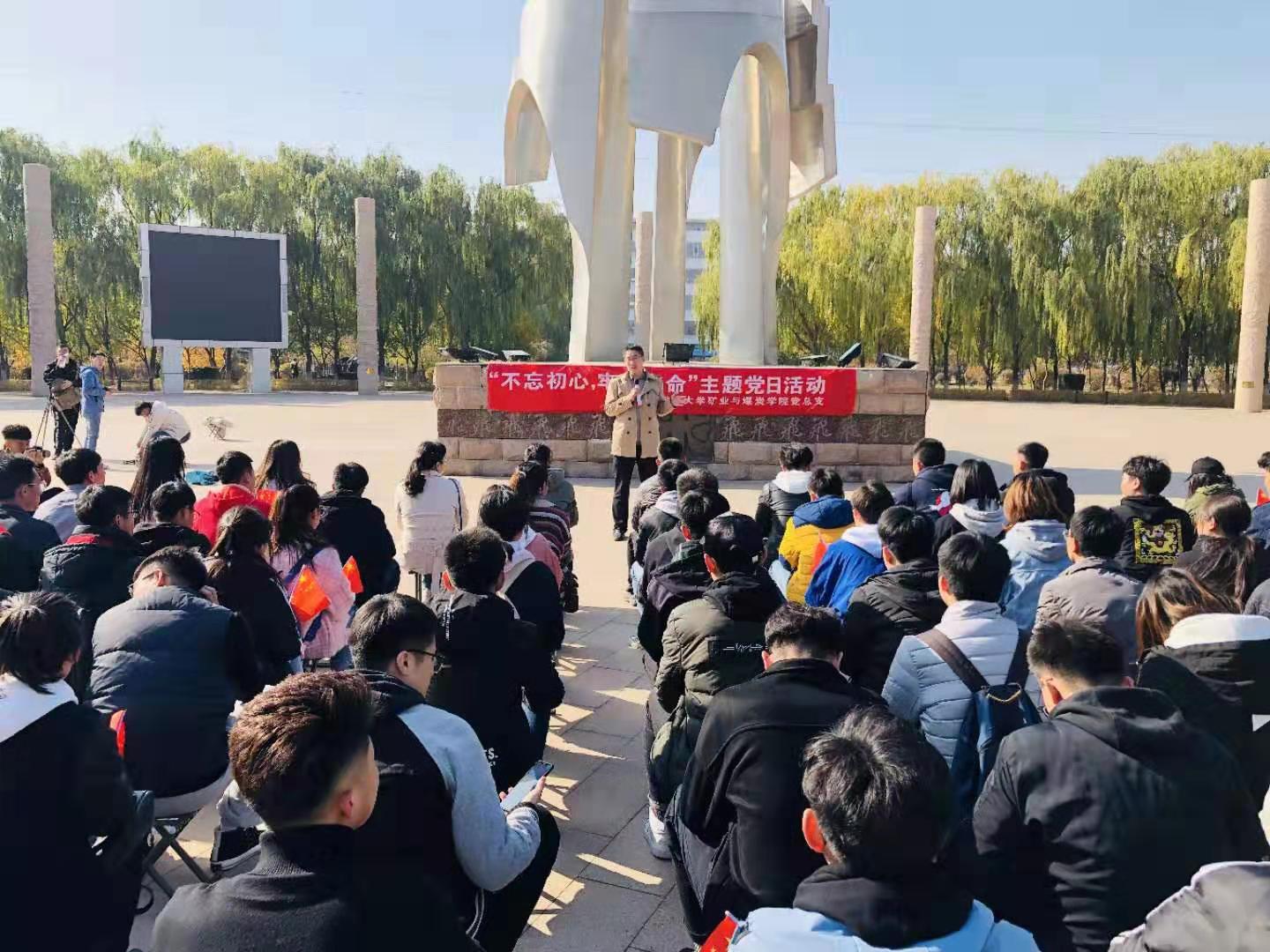 2019年10月26日上午,beat365唯一官方网站组织全体学生党员到北方兵器城开展庆祝中华人民共和国成立70周年“不忘初心、牢记使命”主题党日活动,学院党总支组织委员、学生党支部书记胡显峰老师为学生进行主题党日教育现场讲党课。党课主要围绕以下内容展开讲解: