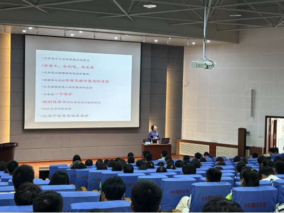 王院长代表学院热烈欢迎2023级新同学的到来,院长就“专业与未来”这一话题,与同学们分享了她的观点。她从大学教育的本质、为什么读大学、怎么读大学三个维度,全面介绍了各专业的学习方向、倡导同学们做好人生规划,并就如何度过充实、高效、有意义的大学生活提出建议。她表示,作为新时代的化大青年,我们要热爱祖国,培养爱党爱国的家国情怀;要勤奋学习,练就过硬的专业水平;要服务人民,追求卓越,强于实践,积极践行为人民谋幸福,为民族谋复兴,弘扬新时代化大精神,实现人生价值。王院长借用“眼界决定境界、思路决定出路、脑袋决定口袋、定位决定地位、细节决定成败、态度决定高度”,对同学们提出了殷殷嘱托,她强调,同学们要勤学善思,不断丰富自己的头脑,提高自己的修养,要准确的认识自己,以准确的定位指引方向,配合恰当的努力促成更优秀的自己。