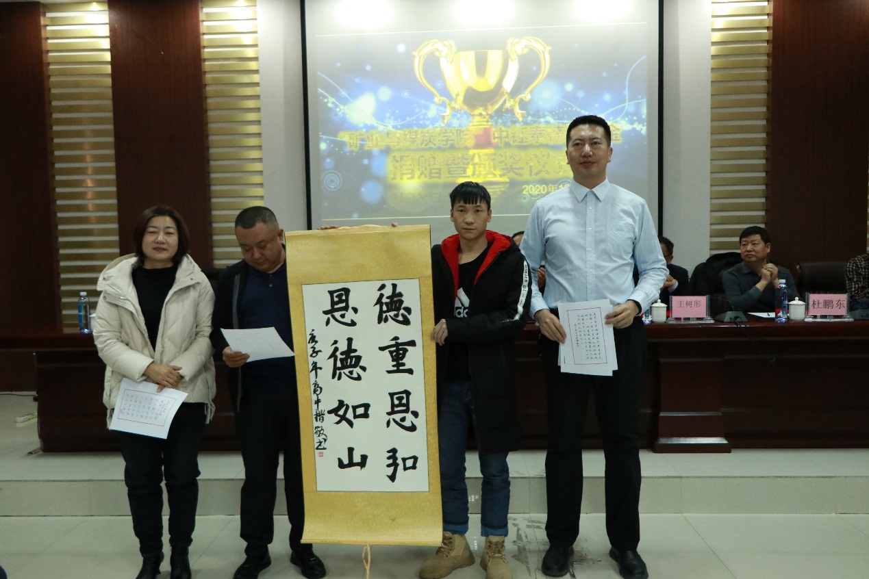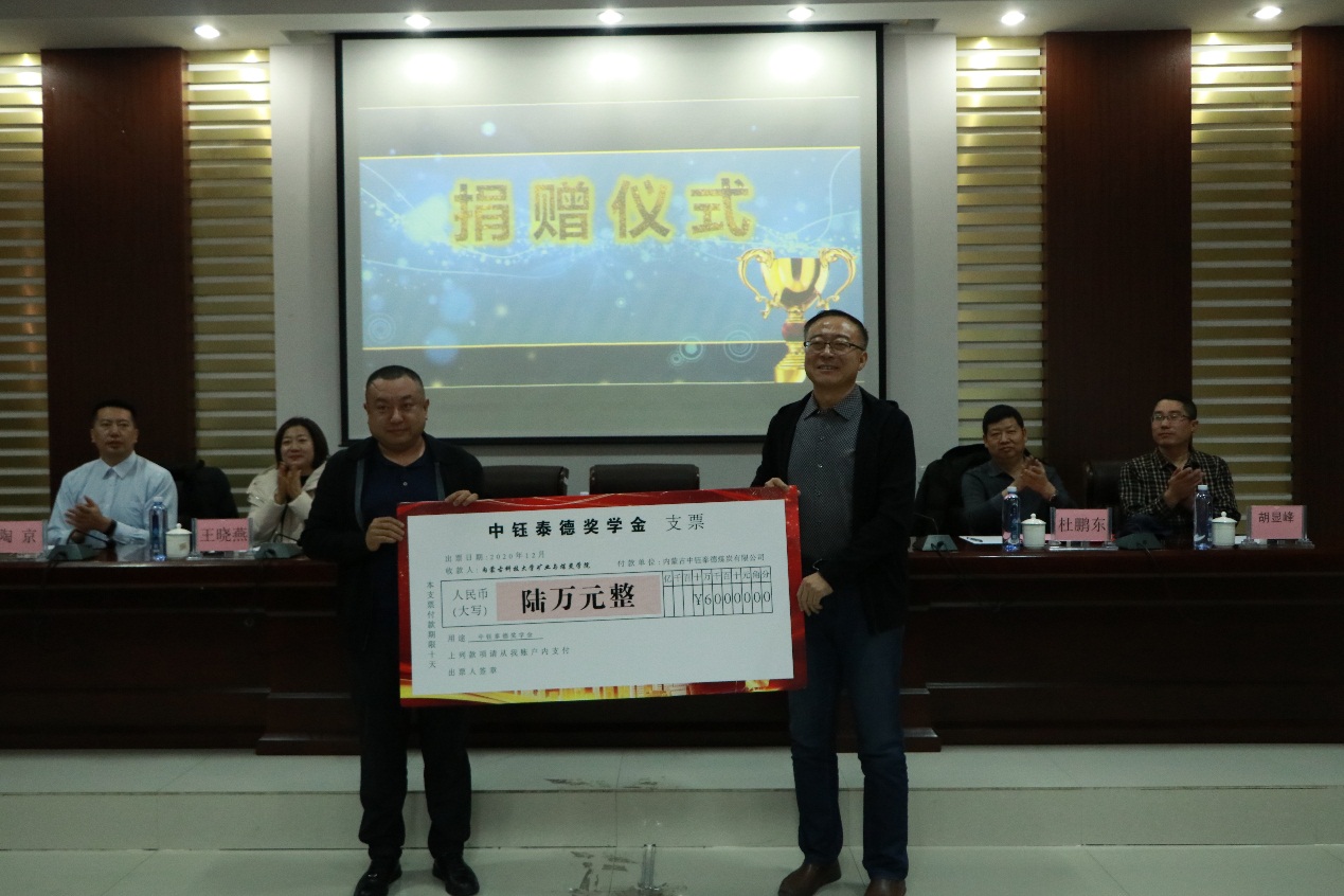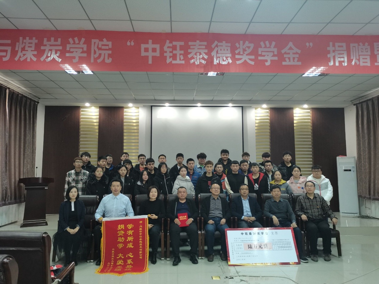 2020年12月9日下午15:00,beat365唯一官方网站在实验实训楼会议室举行了“中钰泰德奖学金”捐赠暨颁奖仪式。出席本次会议的领导和老师有:鄂尔多斯市中钰泰德煤炭有限公司副总经理王维利、副总经济师王晓燕、人力资源部经理陶京;beat365唯一官方网站学生工作部副部长王树彤、beat365唯一官方网站党总支书记王建国、副书记副院长杜鹏东、学生工作办公室主任胡显峰,以及辅导员。