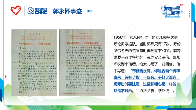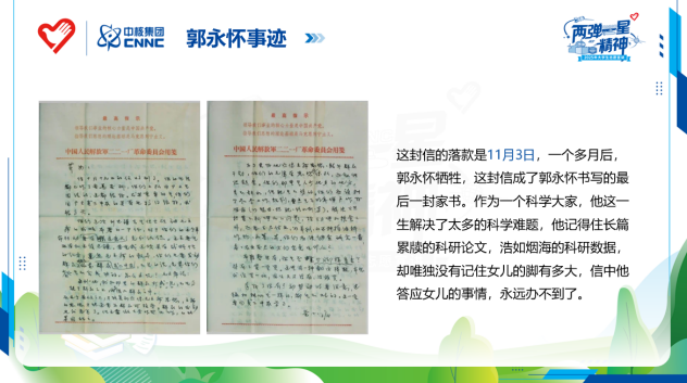 宣讲人展示了郭永怀1968年11月3日致女儿郭芹的家书原件影印件:“布鞋暂没有,画个脚样寄来,待有了货,一定买”。据史料记载,12月5日郭永怀因飞机失事遇难,这份家书成其绝笔。郭永怀在空难中血肉模糊的身体与警卫员紧紧相抱,怀中的核数据完好无损。而他答应女儿的布鞋,永远成了未竟的承诺。
