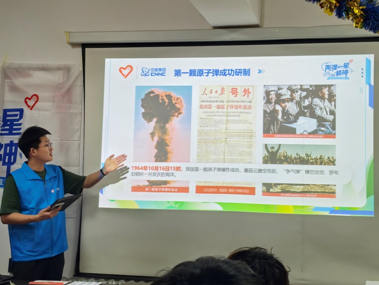 2025年10月16日15时整,中国第一颗原子弹爆炸成功61周年之际,“煤”好星辰志愿宣讲团在包头市昆都仑区沼潭街道地科社区会议室开展主题宣讲,现场33位听众共同观看1964年原子弹爆炸历史影像。1964年同日此时,张爱萍将军正用专线电话向周总理报告:“蘑菇云升起来了!”